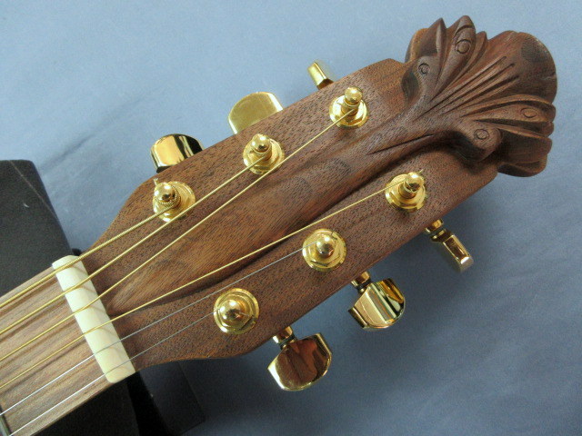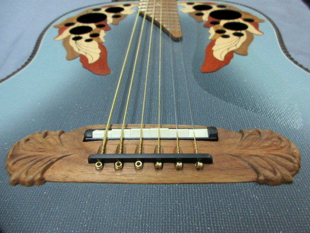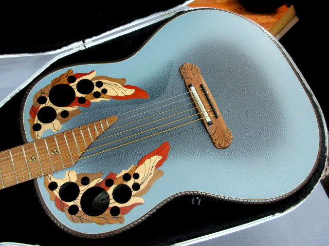 カーボンファイバートップに寄木細工で色鮮やかにデザインされたダブルエポレットリーフサウンドホール